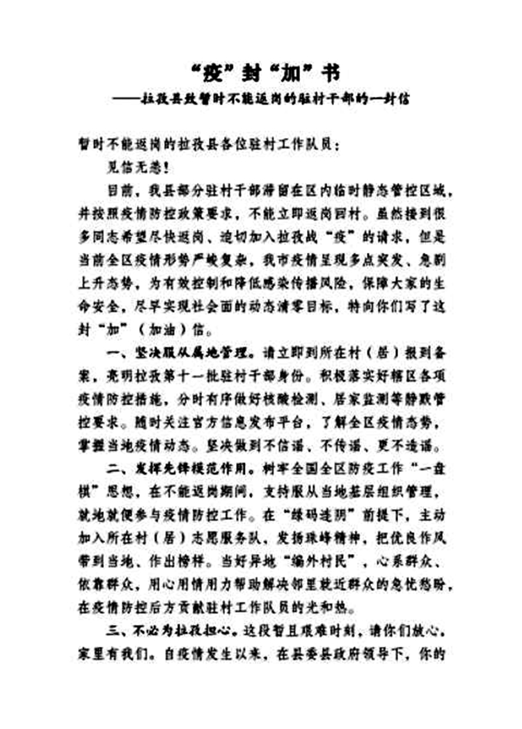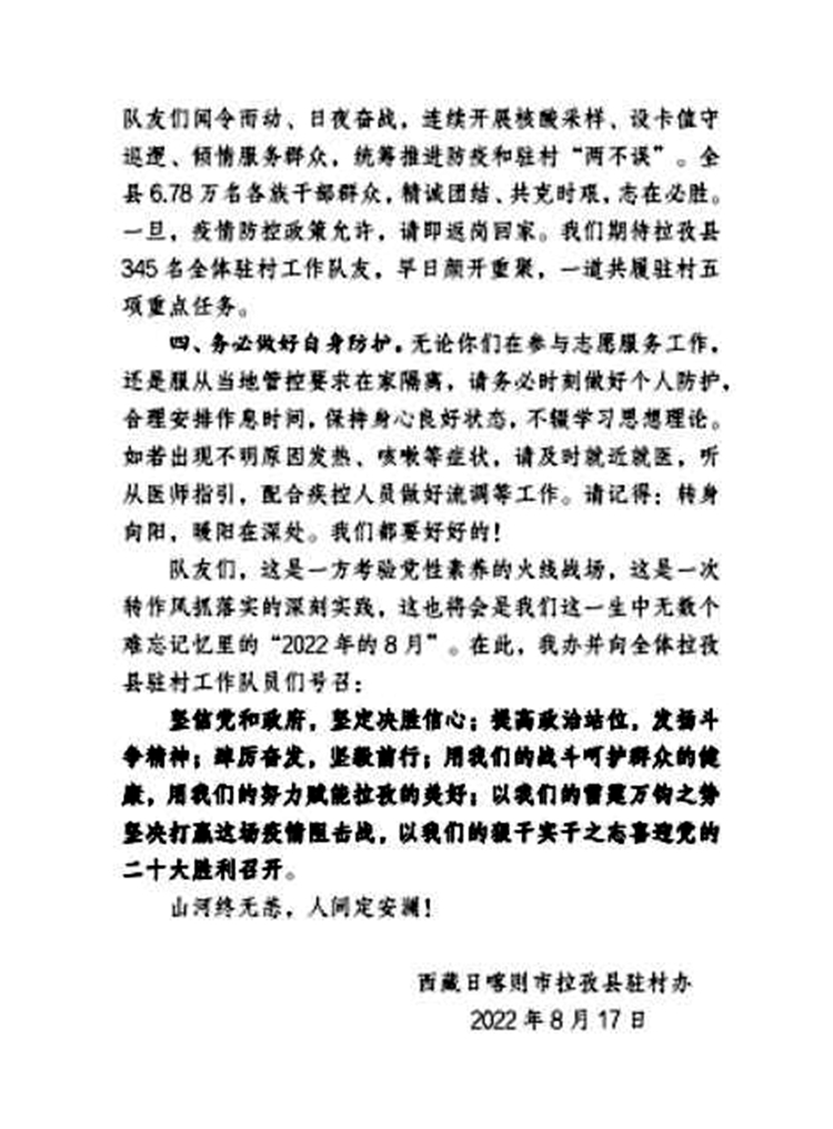 圖為(wei) 西藏日喀則市拉孜縣駐村辦下發給無法返崗的駐村幹部的一封信——“疫”封“加”書(shu)