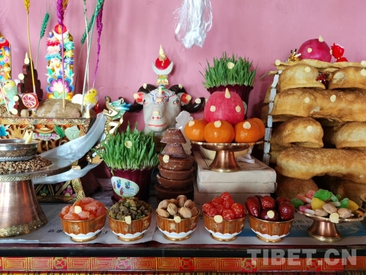 圖為(wei) 藏曆新年期間擺放的切瑪盒等,其中盛放各類幹果的酥油茶碗由中央代表團贈送 攝影:歐帆