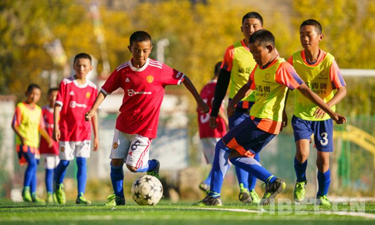 圖為(wei) 2021年全國青少年體(ti) 育冬夏令營進校園活動(西藏站)閉營儀(yi) 式上,學生們(men) 正在進行足球比賽 攝影:趙耀