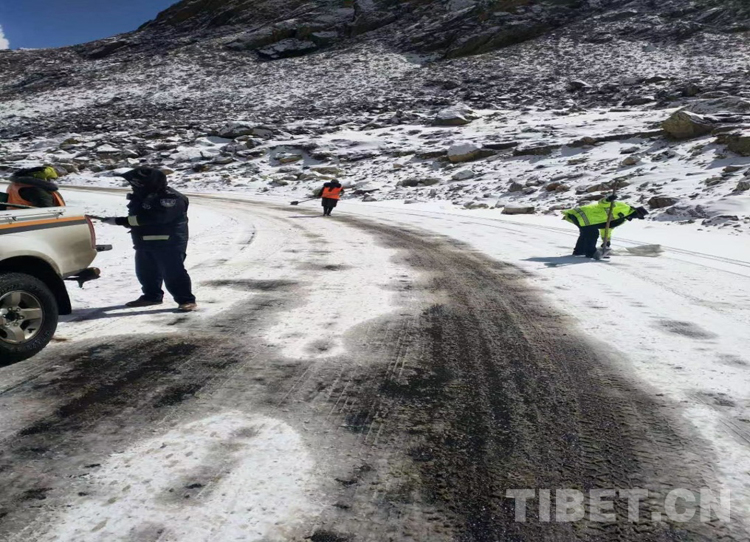 圖為(wei) 西藏自治區山南市公安幹警雪後在道路上鏟雪,便利群眾(zhong) 出行 攝影:拉加當周