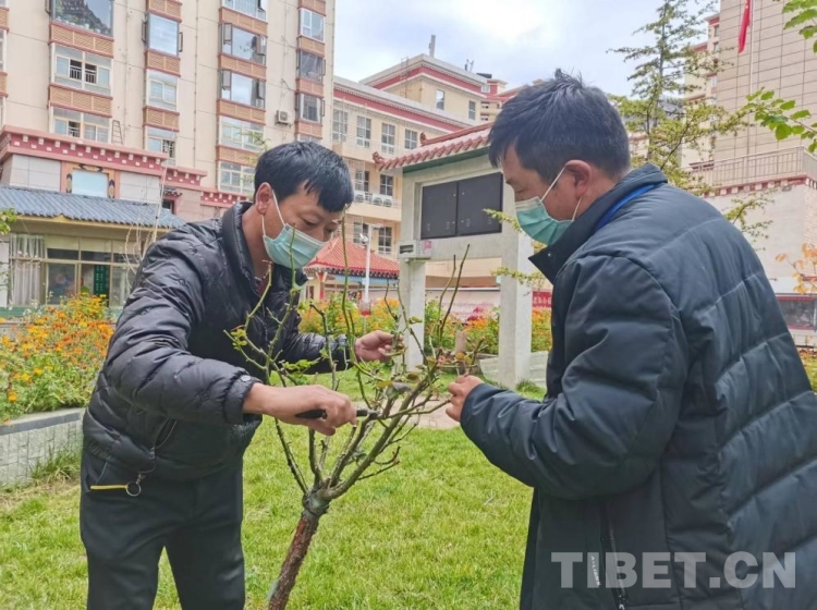 土登丁增(右)教授物業(ye) 工作人員修剪樹枝