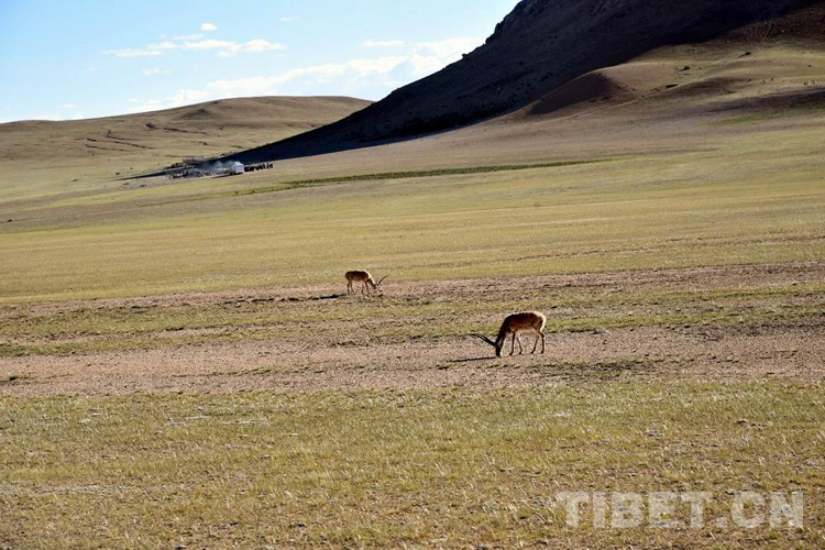 圖為(wei) 羌塘草原上與(yu) 牧民和諧相處的藏羚羊(2022年7月攝) 攝影:彭萍