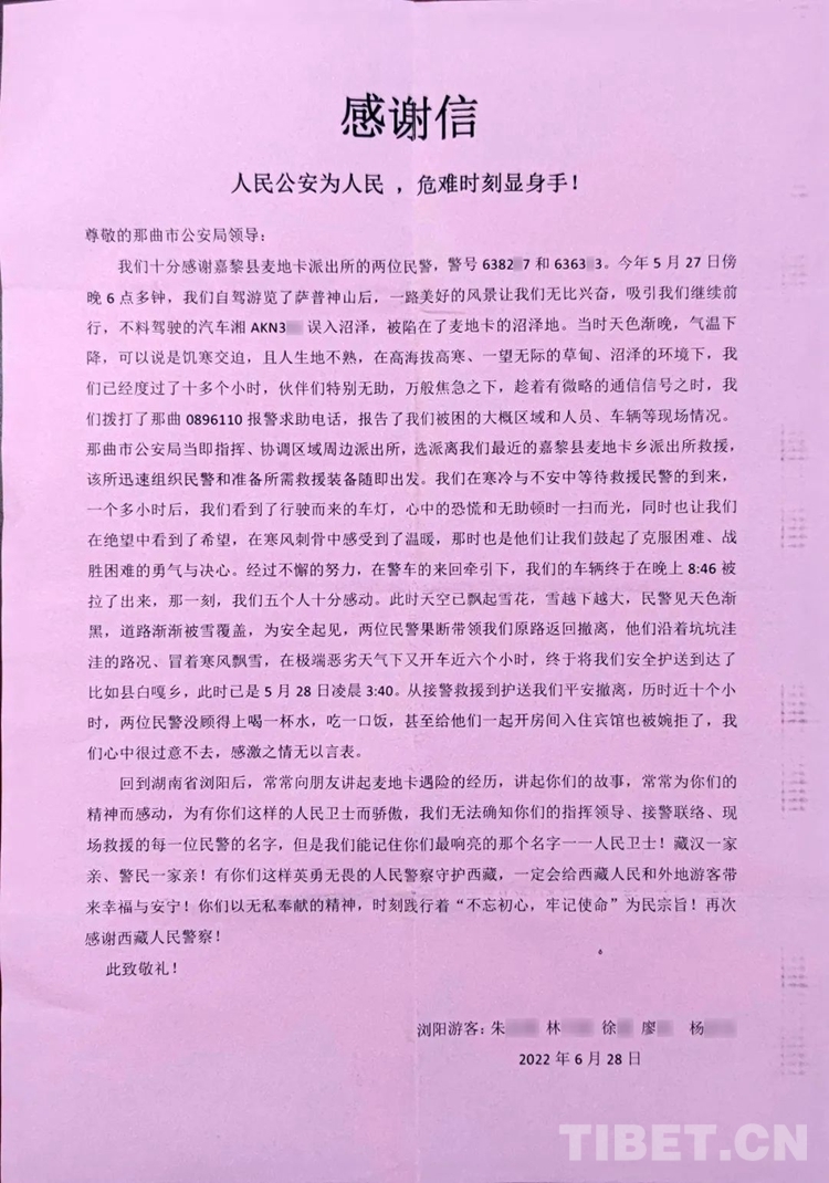 近日,那曲市公安局收到了一份特別的禮物,這是一麵印著“人民公安為(wei) 人民、危難時刻顯身手”的錦旗和一封飽含深情的感謝信。這份特別的禮物是湖南市民朱先生、徐先生寄到西藏的,以此表達對那曲市公安局、那曲市嘉黎縣公安局麥地卡鄉(xiang) 派出所民警的感激之情。