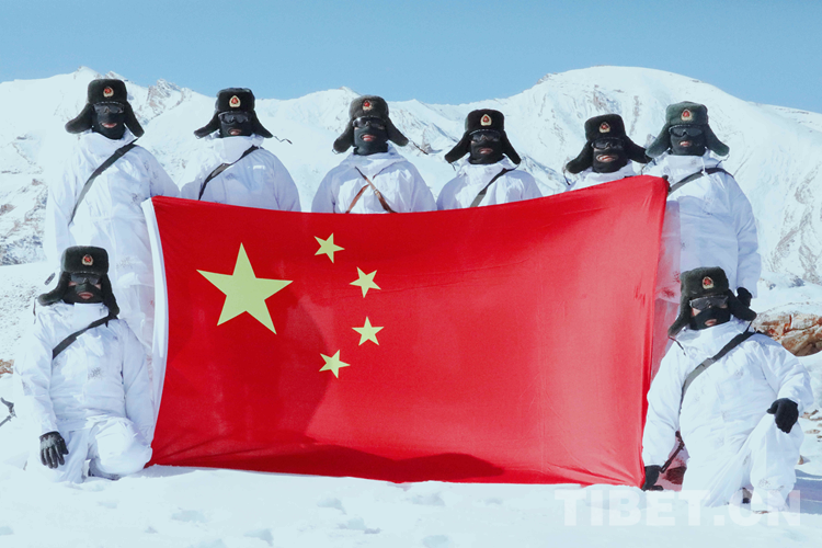 圖為(wei) 阿裏軍(jun) 分區某邊防團官兵在巡邏路上展示國旗 攝影:劉曉東(dong)