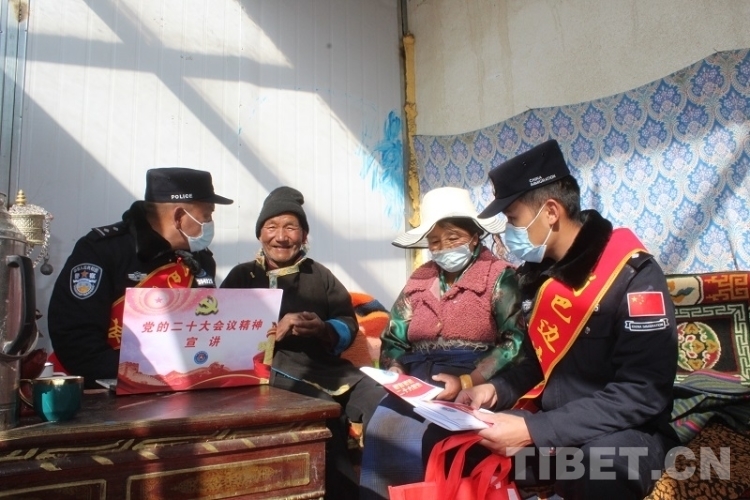 崗巴縣若木新村是易地扶貧搬遷抵邊村,大部分村民漢語水平較差,針對這樣的情況,崗巴邊境派出所挑選了一批懂藏漢雙語的同誌深入群眾(zhong) 身邊,用群眾(zhong) 聽得懂的藏語宣講黨(dang) 的二十大精神,讓村民都能聽得懂、能領會(hui) ,推動黨(dang) 的二十大精神入心入腦。