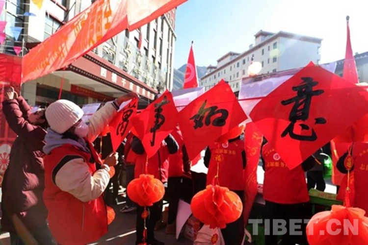 活動現場,隨處可見的中國紅,吸引了眾(zhong) 多市民。一個(ge) 個(ge) 書(shu) 案邊圍滿了人,山南市書(shu) 法家協會(hui) 的13名書(shu) 法家現場潑墨揮毫,免費為(wei) 過往群眾(zhong) 書(shu) 寫(xie) 藏漢文春聯,將濃濃的情意、真誠的祝福融入到作品中,“吉祥如意、福如東(dong) 海、紮西德勒……”字字吉祥,句句喜慶。