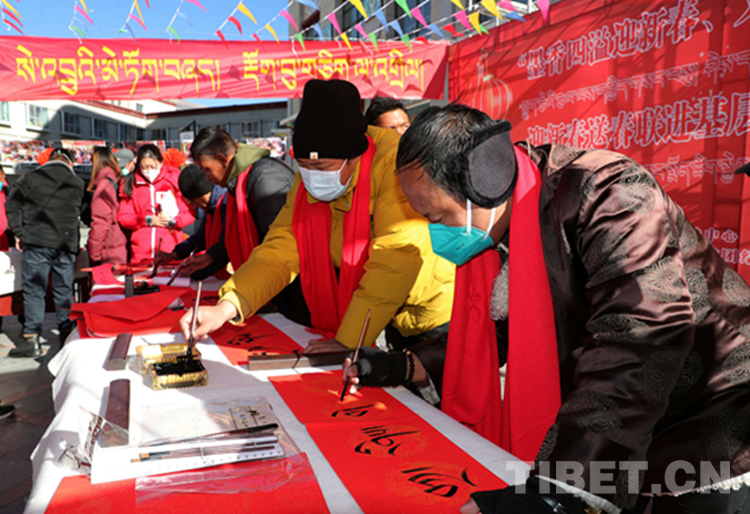 圖為(wei) 活動現場書(shu) 法家在書(shu) 寫(xie) 藏文春聯