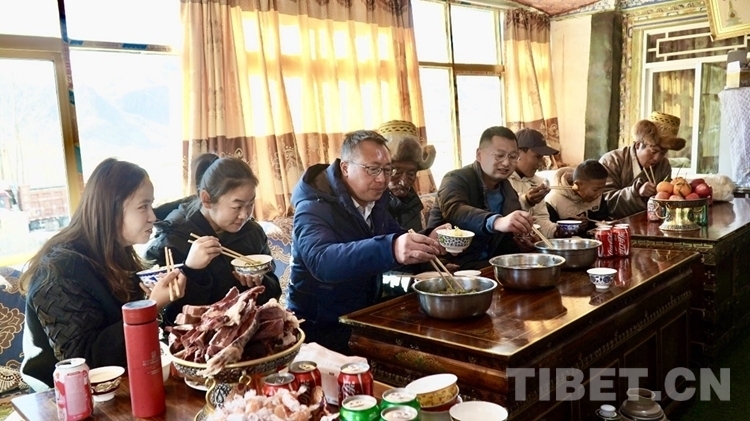 “這些幹部和我們(men) 相處了這麽(me) 長時間,都成自家人了。他們(men) 家在內(nei) 地,但因為(wei) 工作必須堅守崗位。我們(men) 能做的也不多,就是請他們(men) 到家中來吃個(ge) 簡單的團圓飯。” 多章說著,老人的女兒(er) 央金熱情地端來酥油茶。