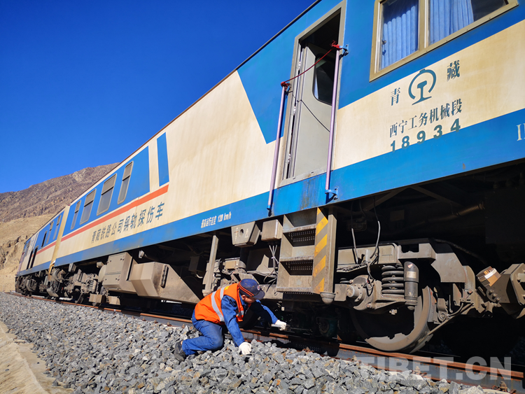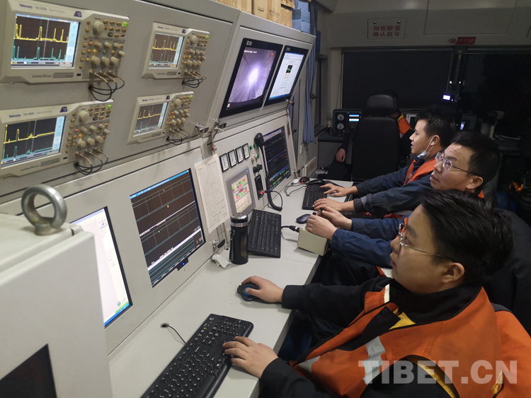 圖為(wei) 工作人員檢測拉日鐵路的鋼軌是否存在內(nei) 部損傷(shang)