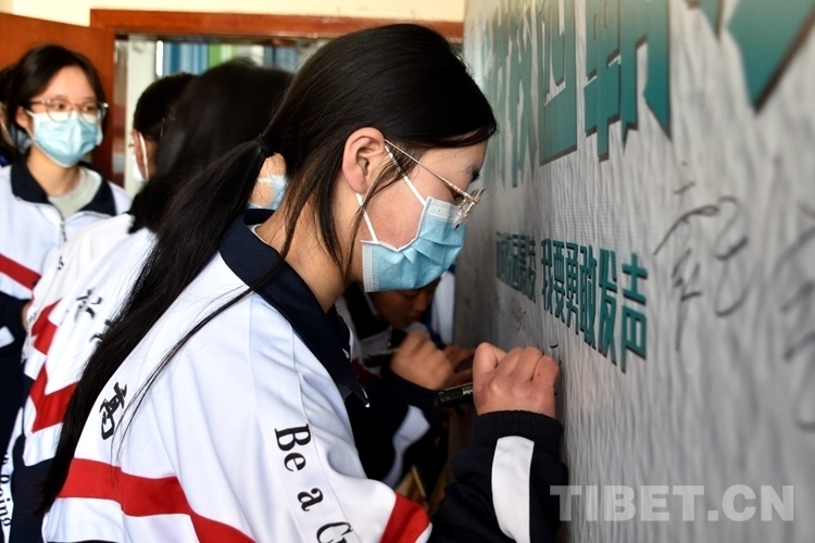 圖為(wei) 學生們(men) 依次在麵對校園霸淩我要勇敢發聲簽名牆進行簽名 攝影:次旦拉姆