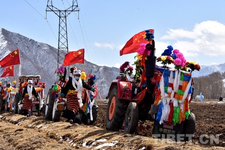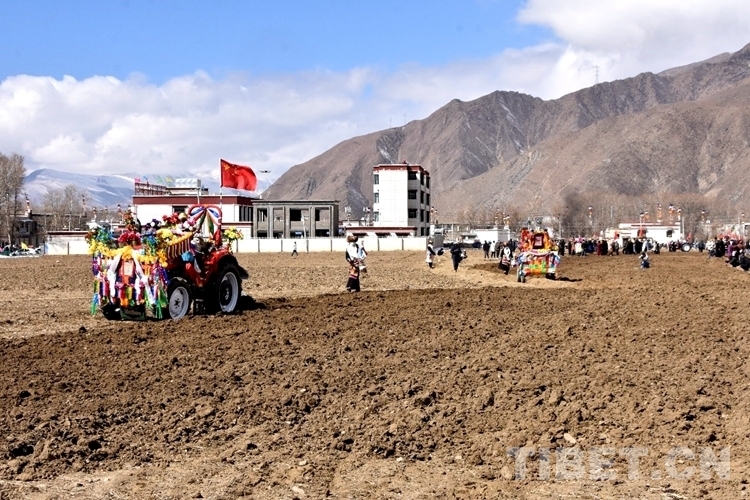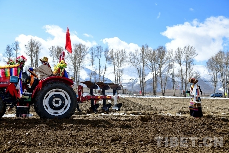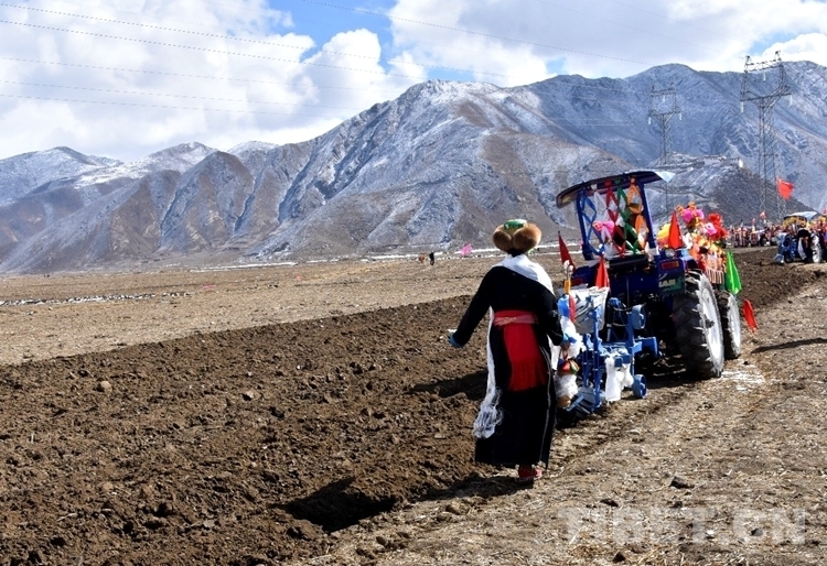 在雪水浸潤過的肥沃土地上,深耕機車輪翻滾而過,駛過的土地上翻起深色的泥土,婦女們(men) 跟在後麵播撒青稞良種。