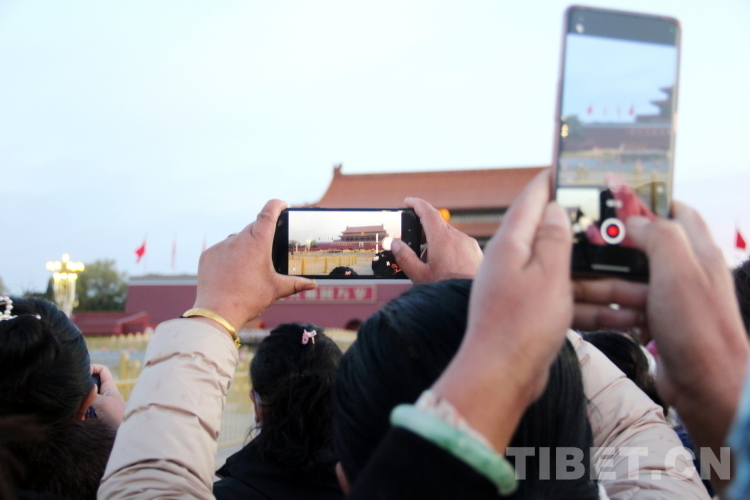 圖為(wei) “2023年西藏基層婦聯幹部赴京學習(xi) 參觀團”成員們(men) 紛紛用手機記錄下國旗護衛隊行進的英姿 攝影:陳浩力