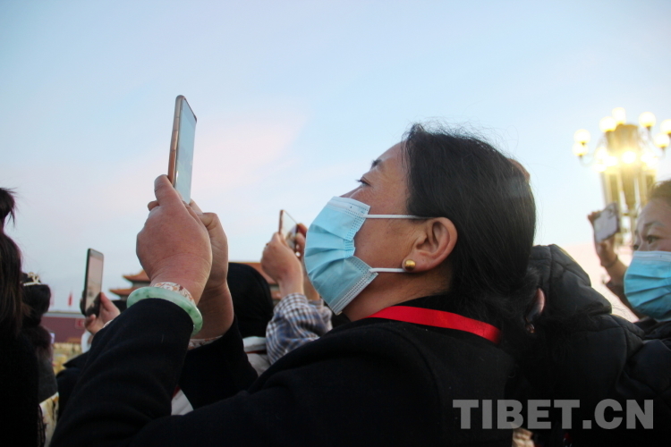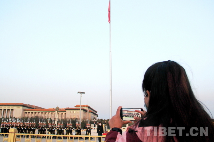清晨6時許,軍(jun) 樂(le) 團在天安門廣場就位。“正步走!”隨著一聲響亮的口令,國旗護衛隊邁著鏗鏘的正步,拱衛國旗走過天安門城樓、金水橋。“向國旗敬禮!”6時9分,隨著響亮的口令,軍(jun) 樂(le) 團奏響了國歌《義(yi) 勇軍(jun) 進行曲》,升旗手高高揚起國旗,鮮豔的五星紅旗迎著朝陽冉冉升起。“2023年西藏基層婦聯幹部赴京學習(xi) 參觀團”成員們(men) 紛紛用手機記錄下這難忘的時刻。