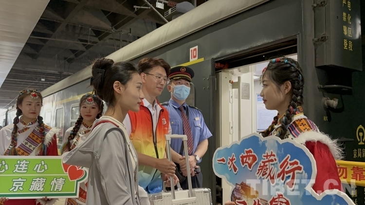 圖為(wei) 旅客登上“心連心·京藏號”援藏旅遊專(zhuan) 列