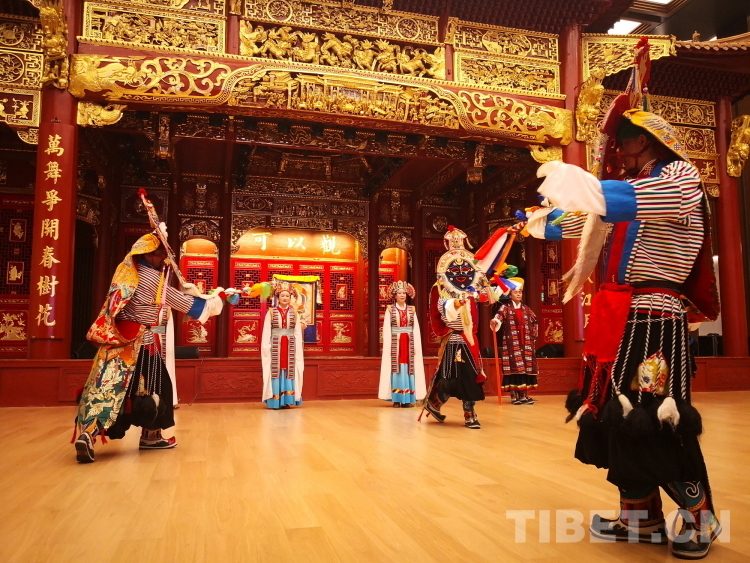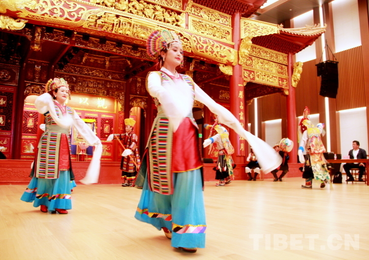 西藏藏劇團副團長米瑪普赤就藏戲的起源、藏戲的特點、藏戲的流派等進行了詳細介紹。伴隨著雄渾響亮的鼓鈸聲,西藏自治區拉薩市城關(guan) 區娘熱民間藝術團的藝術家們(men) 表演了藏戲開場《溫巴頓》、藏戲唱腔《朗薩雯波》之貢桑德慶唱腔、拉薩囊瑪《吉白尼瑪》、嘎爾《郎卓》等經典片段。精美的服飾、鏗鏘的唱腔、緊湊的故事情節……贏得了與(yu) 會(hui) 嘉賓的連連讚歎與(yu) 陣陣掌聲。