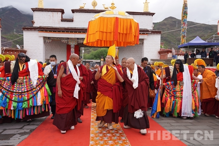 圖為(wei) 班禪(中)在宗洛•向巴克珠活佛(前右)引領下走向措欽大殿 攝影:王淑
