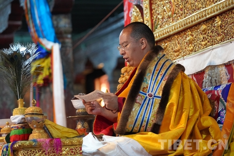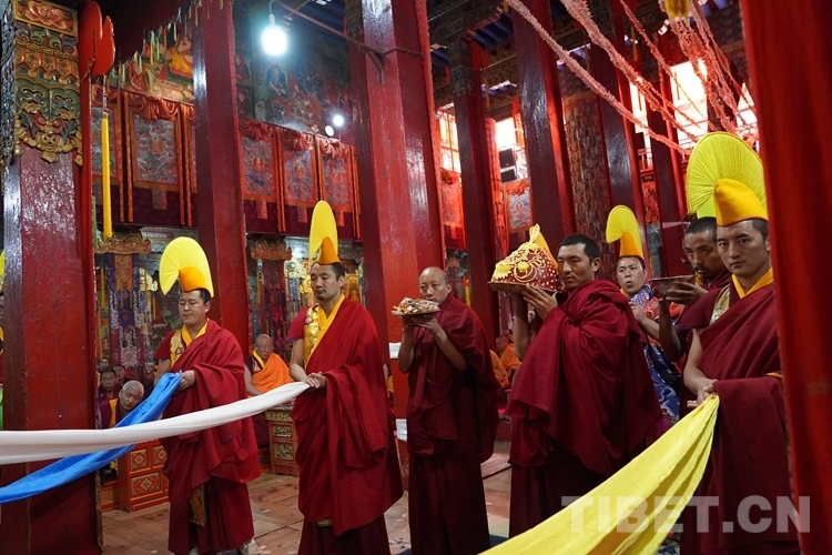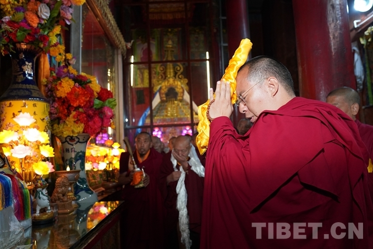 在措欽大殿內(nei) ,班禪每到一座佛像前都雙手合十為(wei) 眾(zhong) 生祈禱,並向佛像敬獻哈達,祈求國泰民安、利樂(le) 眾(zhong) 生。措欽大殿內(nei) 的眾(zhong) 僧也並排而坐齊聲誦經、虔誠祝禱。禮佛後,班禪登上措欽大殿寶座,寺廟高僧代表向班禪敬獻曼紮(佛像、經書(shu) 、佛塔)、誦祈願永駐讚;班禪向寺廟僧眾(zhong) 傳(chuan) 授賜予《文殊真實名經》,並為(wei) 僧眾(zhong) 摸頂。