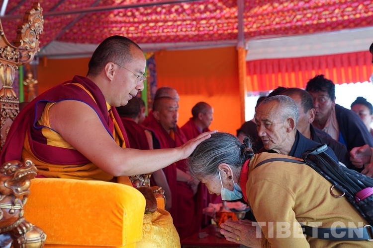 年逾七旬的洛桑巴姆得到班禪摸頂後倍感殊勝,激動地落下了眼淚。“能拜見活佛特別開心,得到活佛的摸頂賜福是我的福分。”洛桑巴姆不斷回頭麵向班禪躬身祈禱,久久不願離去。