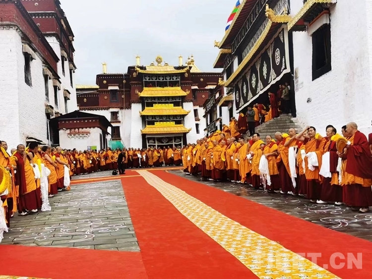 當天清晨,強巴林寺桑煙氤氳,僧人儀(yi) 仗隊早早在寺廟正門通往措欽大殿的通道兩(liang) 側(ce) 手捧哈達列隊等候,以藏傳(chuan) 佛教最高宗教儀(yi) 軌迎接班禪。