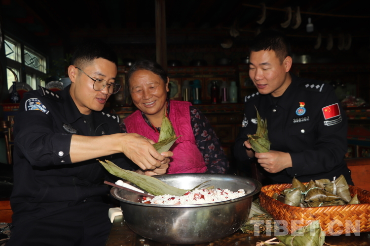 圖為(wei) 魯霞邊境派出所民警前往轄區珍噶老人家中開展包粽子活動 攝影:伍俊丞