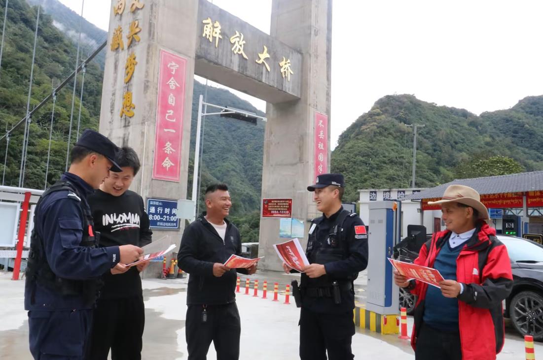 圖為(wei) 背崩邊境派出所解放大橋執勤點民警為(wei) 過往群眾(zhong) 講解邊境條例相關(guan) 知識 攝影:呂恒剛