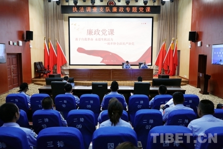 圖為(wei) 西藏邊檢總站執法調查支隊黨(dang) 委副書(shu) 記、政治委員為(wei) 全體(ti) 民警講授廉政專(zhuan) 題黨(dang) 課 攝影:仁青旺堆