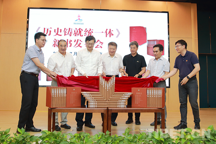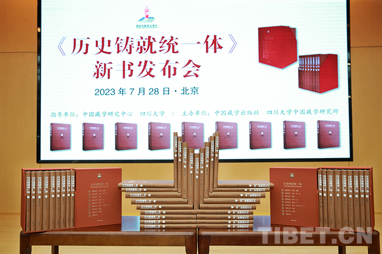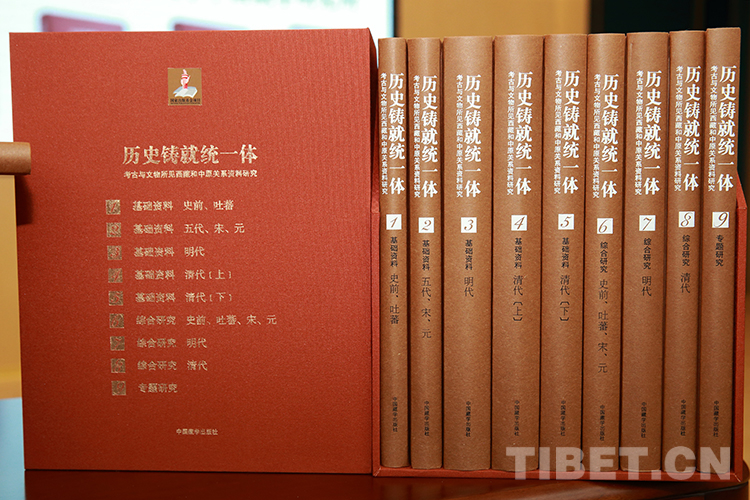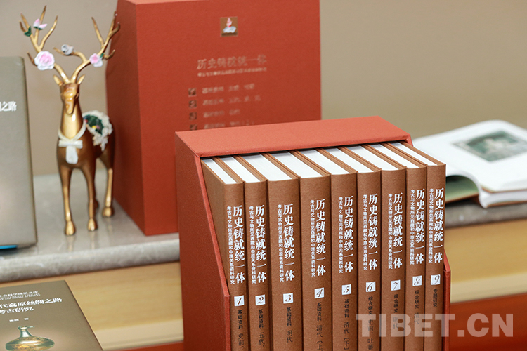 圖為(wei) 發布會(hui) 現場展覽的《曆史鑄就統一體(ti) :考古與(yu) 文物所見西藏和中原關(guan) 係資料研究》全套圖書(shu) 攝影:陳衛國