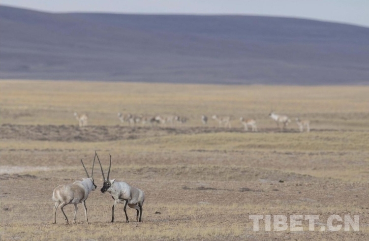 圖為(wei) 羌塘自然保護區內(nei) ,正在決(jue) 鬥的兩(liang) 隻強壯的公藏羚羊。 攝影:達瓦次仁