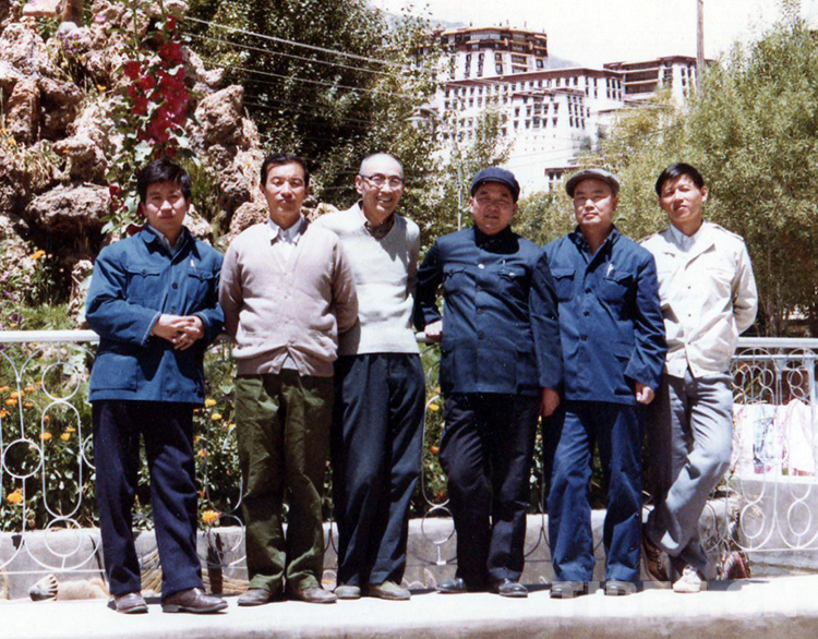 原國務院西藏經濟工作谘詢組駐藏組範小建(右一)與(yu) 本組人員趙清政、石萬(wan) 鵬、齊曉魯、府培生、冉令申(從(cong) 左至右)在拉薩布達拉宮前合影留念(範小建提供,1984年6月攝)
