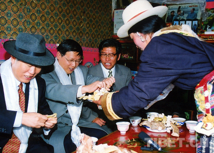 時任農(nong) 業(ye) 部副部長範小建(左二)在隨慶祝西藏自治區和平解放五十周年代表團再次回到西藏時,與(yu) 代表團其他成員一同在藏族群眾(zhong) 家中做客,了解生產(chan) 和生活情況(範小建提供照片,2001年9月攝)