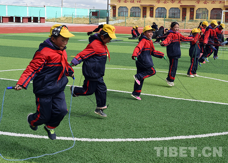 西藏那曲地區那曲縣(現那曲市色尼區)羅瑪鎮中心小學的學生們(men) 在進行跳繩比賽(唐召明2016年10月5日攝)