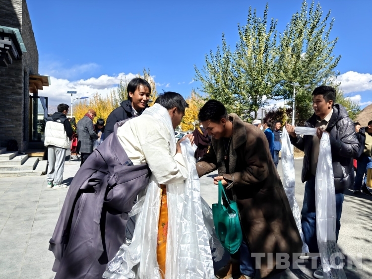 圖為(wei) 學生們(men) 向丹巴繞旦之子、西藏丹巴繞旦唐卡藝術學校校長旦增平措敬獻哈達,表達對丹巴繞旦教授的敬意