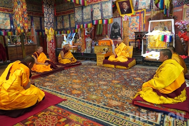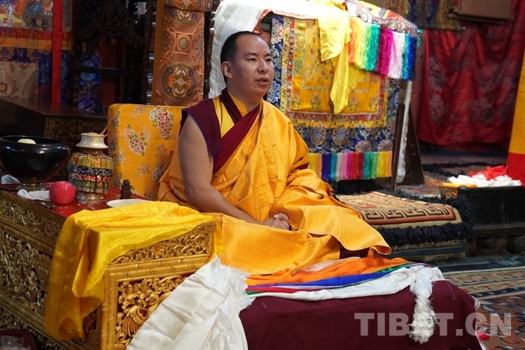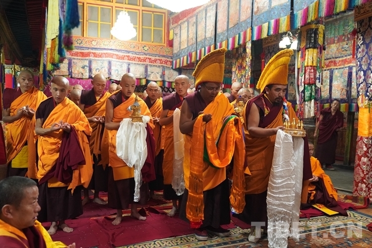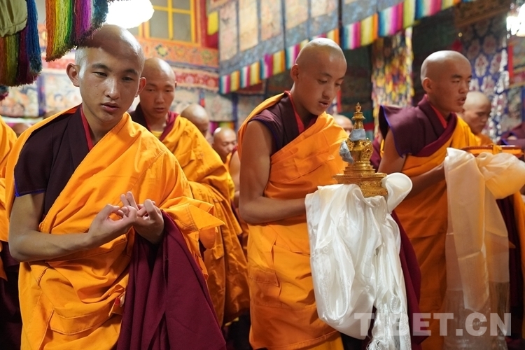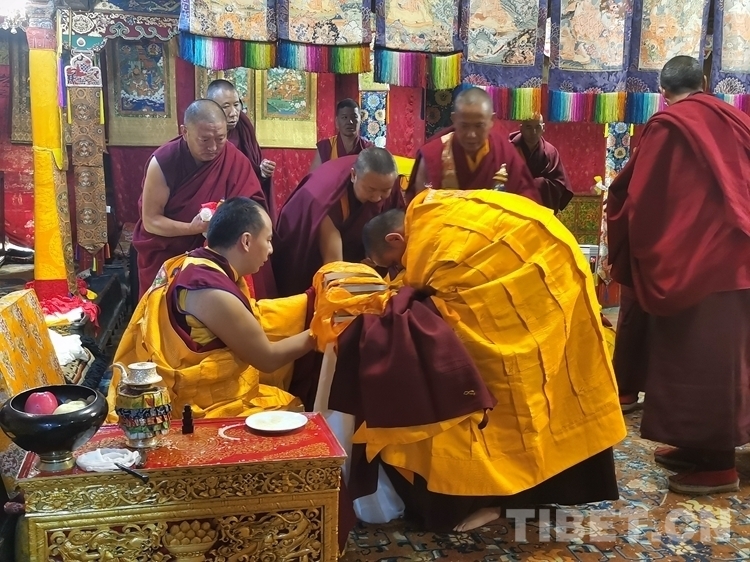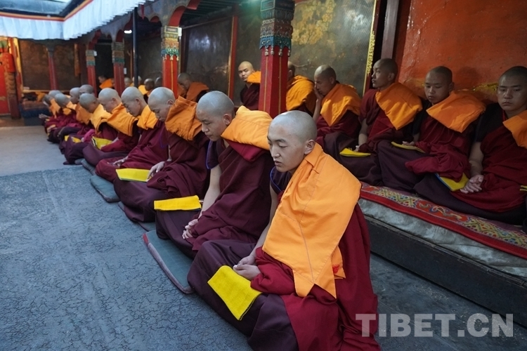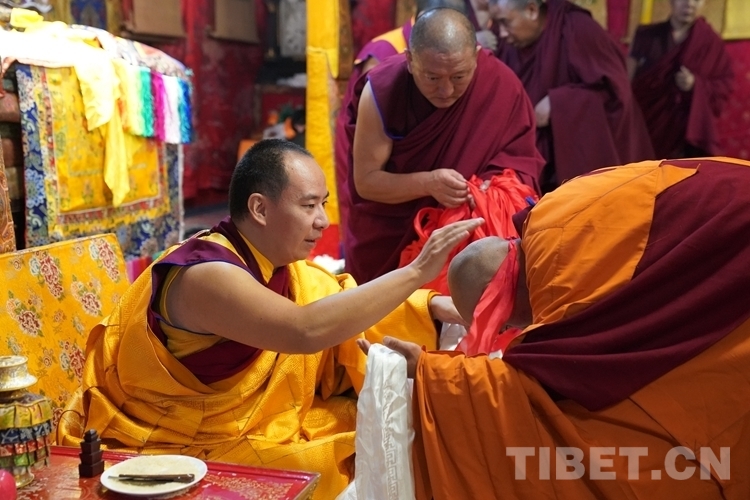 當天清晨,紮什倫(lun) 布寺桑煙繚繞、法號聲聲,28 位受戒的年輕僧人帶著新製袈裟,迎著朝霞依次走向拉讓殿等待班禪授戒這一神聖時刻的到來。8時許,在手持黃傘(san) 、香爐和吹嗩呐的高僧護送引領下班禪緩緩步入拉讓殿,並與(yu) 在場僧眾(zhong) 集體(ti) 誦經。誦經儀(yi) 式結束後,班禪就坐於(yu) 拉讓殿寶座,4名高僧大德作為(wei) 授戒眾(zhong) ,開始為(wei) 僧人閉門授戒、剃度、賜法名、摸頂。此時,受戒僧人一一入座,兩(liang) 手在胸前交叉,聽班禪引證經典告誡,並宣誓嚴(yan) 守戒律。