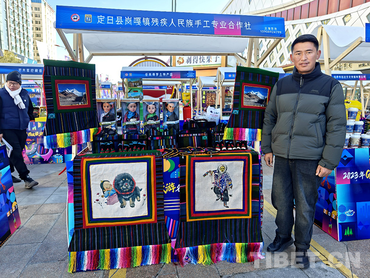 圖為(wei) 定日縣崗嘎鎮殘疾人民族手工業(ye) 專(zhuan) 業(ye) 合作社工作人員索朗次仁在自己的展台前留影