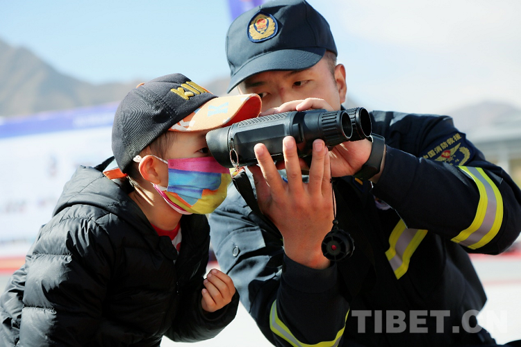 圖為(wei) 啟動儀(yi) 式現場拉薩消防指戰員向前來參觀的小朋友介紹測距儀(yi)