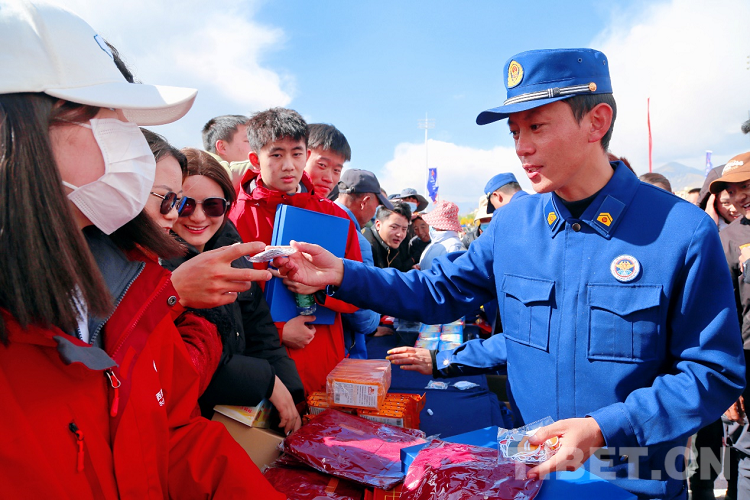 圖為(wei) 啟動儀(yi) 式現場拉薩消防指戰員向市民發放文創產(chan) 品和宣傳(chuan) 資料