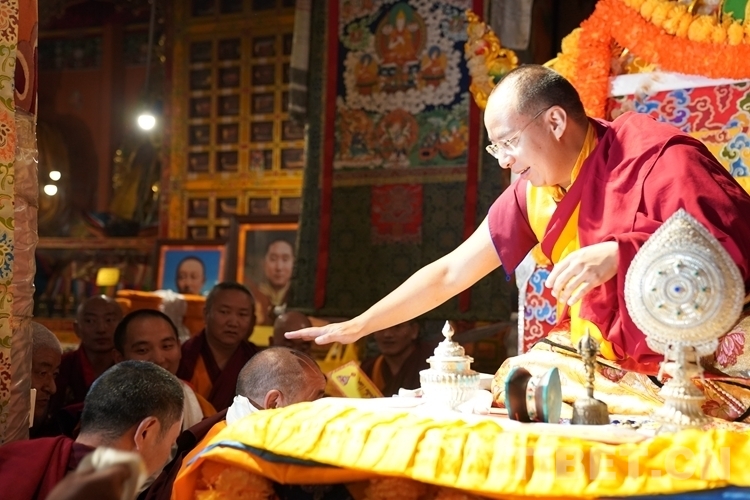 當日12時許,班禪一行抵達日吾其鄉(xiang) ,班禪笑容慈和地一一為(wei) 等候在寺廟前的信教群眾(zhong) 摸頂,並向表演迥巴藏戲的信教群眾(zhong) 揮手致意。隨後,手持香爐的高僧和吹嗩呐的僧人引路,在手持黃傘(san) 的高僧護送下,班禪緩步進入主殿,朝拜大威德金剛拉康,參觀石刻、擦擦文物陳列室後登上大殿寶座,向寺廟僧眾(zhong) 傳(chuan) 授《勝道啟門頌》,為(wei) 僧眾(zhong) 摸頂。