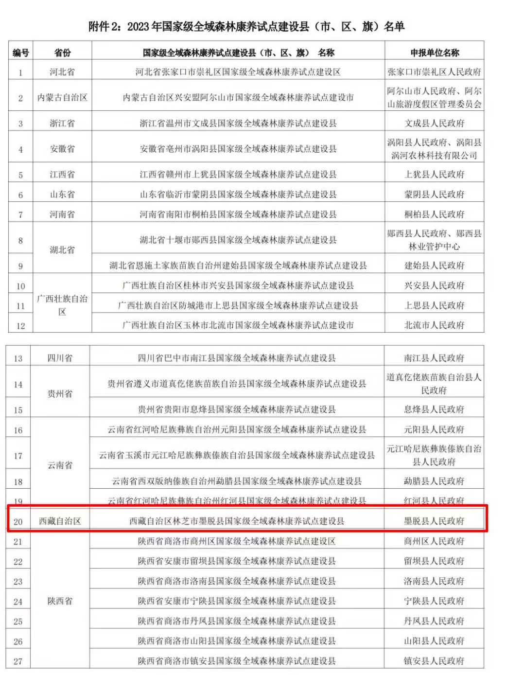 新利平台訊 11月22日,中國林業(ye) 產(chan) 業(ye) 聯合會(hui) 公示了2023年國家級森林康養(yang) 試點建設單位名單,西藏自治區林芝市墨脫縣入選2023年國家級全域森林康養(yang) 試點建設縣,係西藏自治區唯一入選的縣。