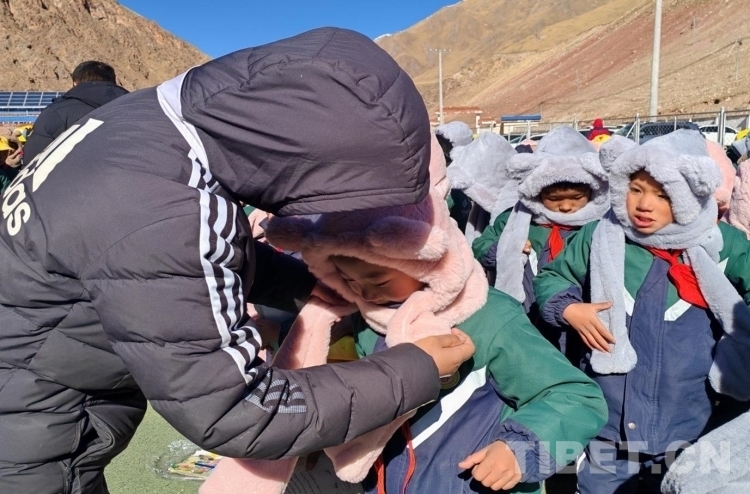 圖為(wei) 孩子們(men) 戴上溫暖的圍巾手套一體(ti) 帽,臉上樂(le) 開了花
