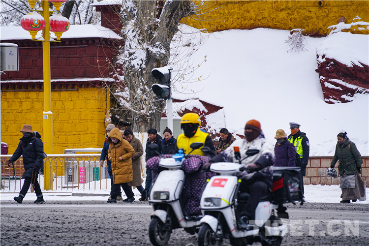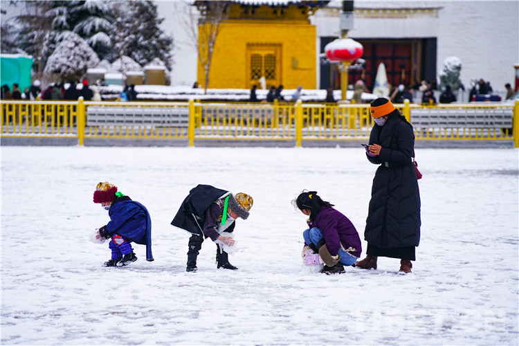 第四站,布達拉宮廣場。“給我一瓶礦泉水,我能還你兩(liang) 座布達拉宮。”比起什麽(me) 時候都可以在這裏拍的布達拉宮倒影,雪中的布達拉宮廣場可謂是“可遇不可求”。南方的遊客在這裏激動地高喊“我終於(yu) 見到雪了”,北方的遊客抖抖肩膀上的雪花繼續拍攝下一組寫(xie) 真,本地的藏族娃娃和小夥(huo) 伴們(men) 一起追逐嬉戲,雪中的西藏和平解放紀念碑顯得更加巍峨。