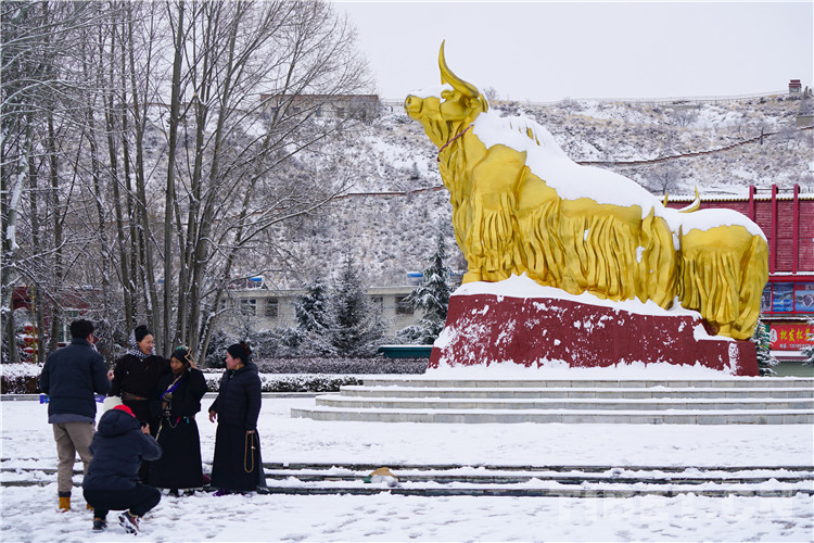 第二站,銅牛廣場。銅牛廣場位於(yu) 布達拉宮西南方向約300米處,北京中路與(yu) 林廓西路在此相交。這裏是開放式的人行道,非常開闊,是通往布達拉宮廣場的必經之路,很多人都在此合影留念。雪中的銅牛披上了白色的“外衣”,更加體(ti) 現出“憨厚、忠誠、悲憫、堅韌、勇悍、盡命”的犛牛精神。