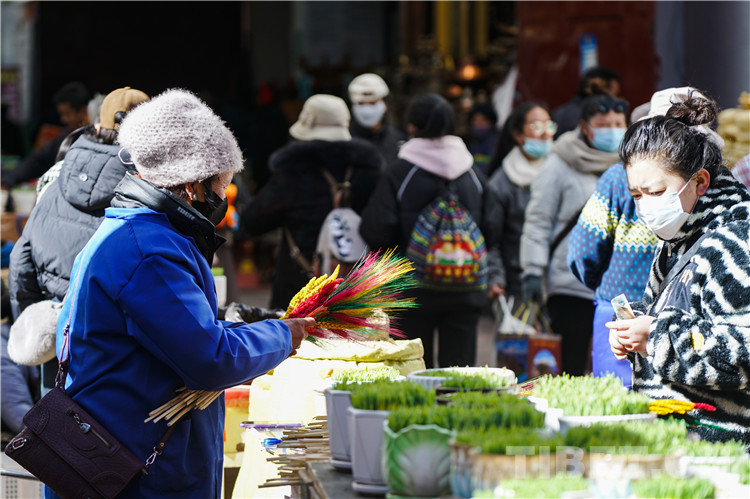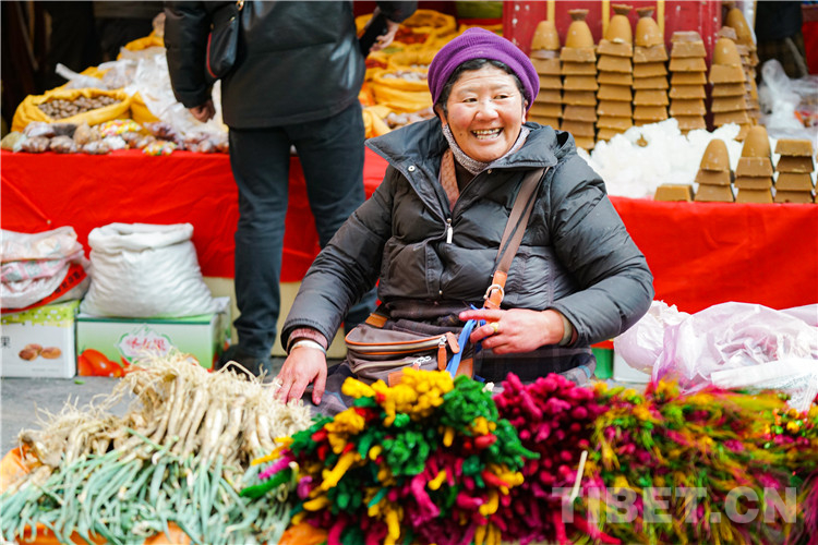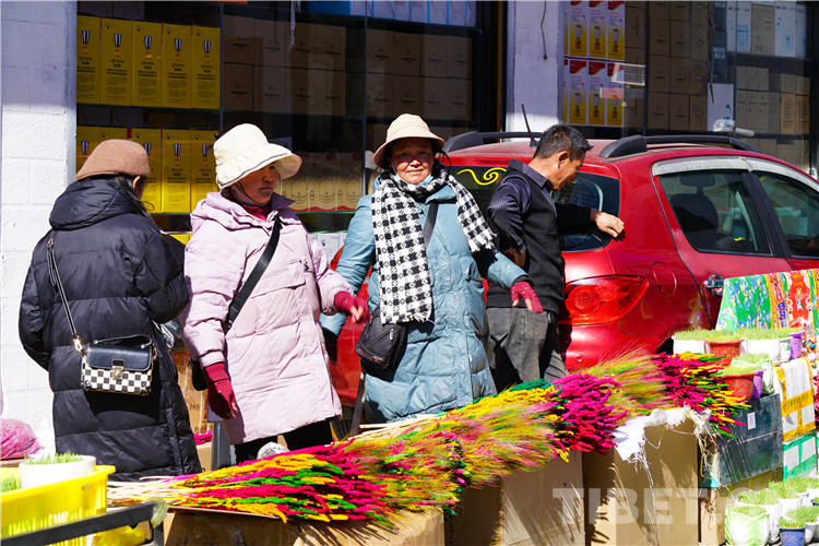 圖為(wei) 正在銷售青稞苗和“洛薩美朵”的藏族阿佳 攝影:趙振宇