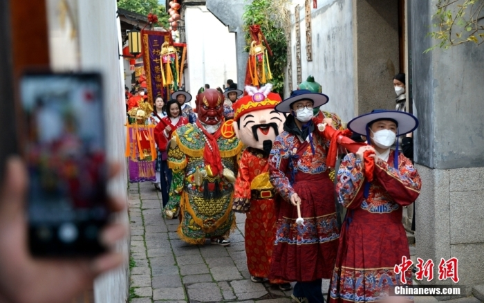 圖為(wei) 福州三坊七巷天後宮舉(ju) 行“迎財神”民俗巡遊活動,吸引許多人駐足觀看。攝影:呂明