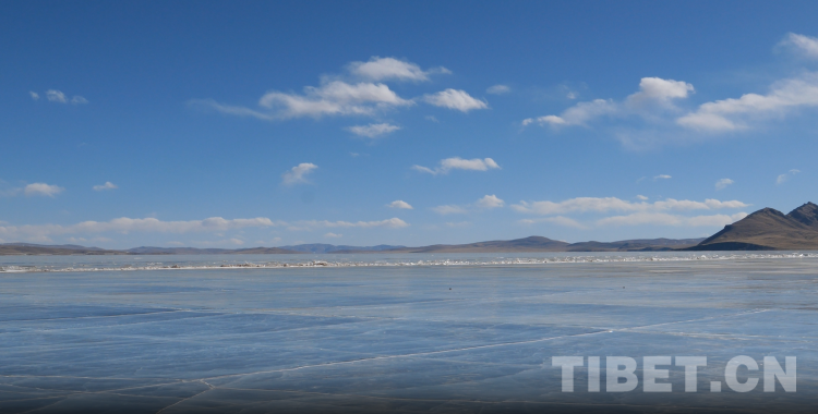 二月的那曲,滴水成冰。然而這天寒地坼的初春,正是觀賞冰湖奇景的黃金季節。藏北高原漫長的冬季帶來長期的低溫,使得錯那湖湖麵被冰蓋封住,隻見一塊麵積可觀的湛藍冰層橫亙(gen) 在羌塘草原之上,不見湖水流動,隻有湖冰順岸鋪遠,向遠處的卓格山綿延。