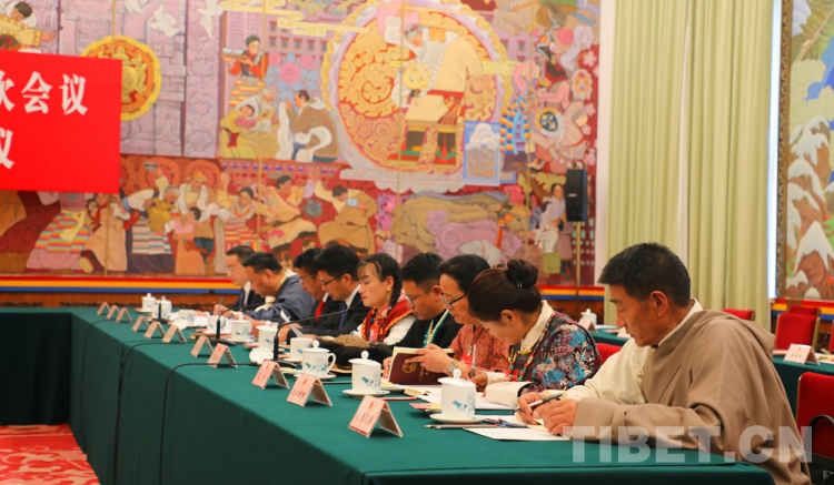圖為(wei) 紮西江村(右四)參加十四屆全國人大二次會(hui) 議西藏代表團開放團組會(hui) 議 攝影:桑吉
