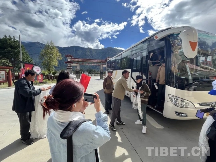 圖為(wei) 門仲村工作人員為(wei) 遊客獻哈達表示歡迎
