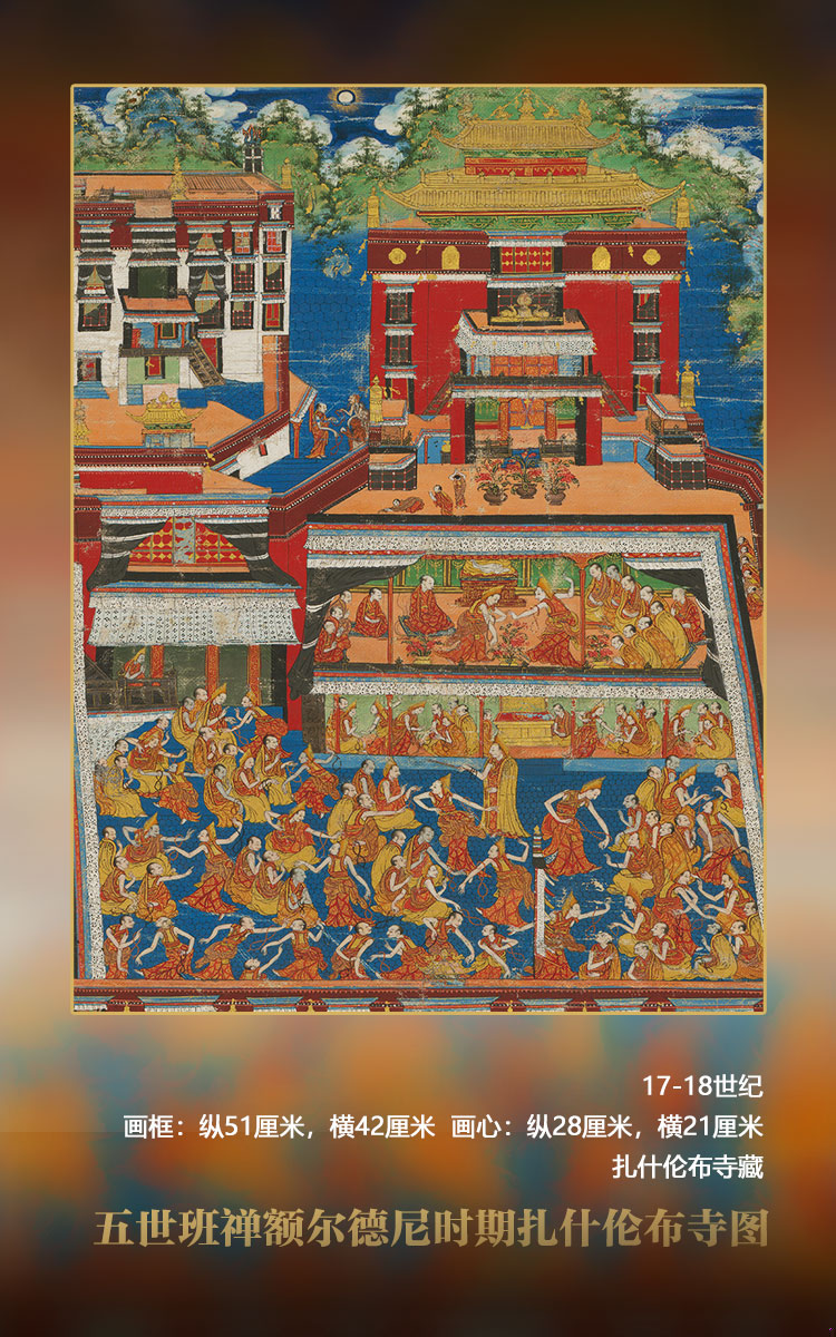 畫麵以四世班禪靈塔殿為(wei) 中心而不及其他,推測其年代應為(wei) 五世班禪時期。