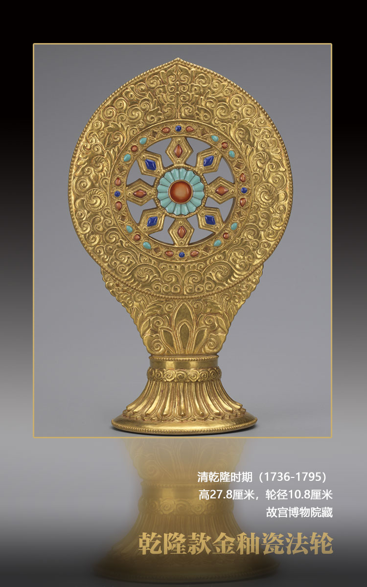 清代皇家崇奉藏傳(chuan) 佛教,乾隆登基後曾命內(nei) 務府造辦處下屬的景德鎮禦窯廠燒製各式瓷質佛像與(yu) 法器備供奉之用。此款金釉瓷法輪仿自當時銅鎏金法輪,為(wei) 乾隆朝所首創,至嘉慶朝仍有製作,隻是底款不同,型製並無區別。這種瓷質法輪不僅(jin) 以金彩仿出銅鍍金效果,還以色彩鮮豔的釉色仿出綠鬆石、青金石、珊瑚等各種寶石,不得不讚歎當時工藝的創新與(yu) 突破。