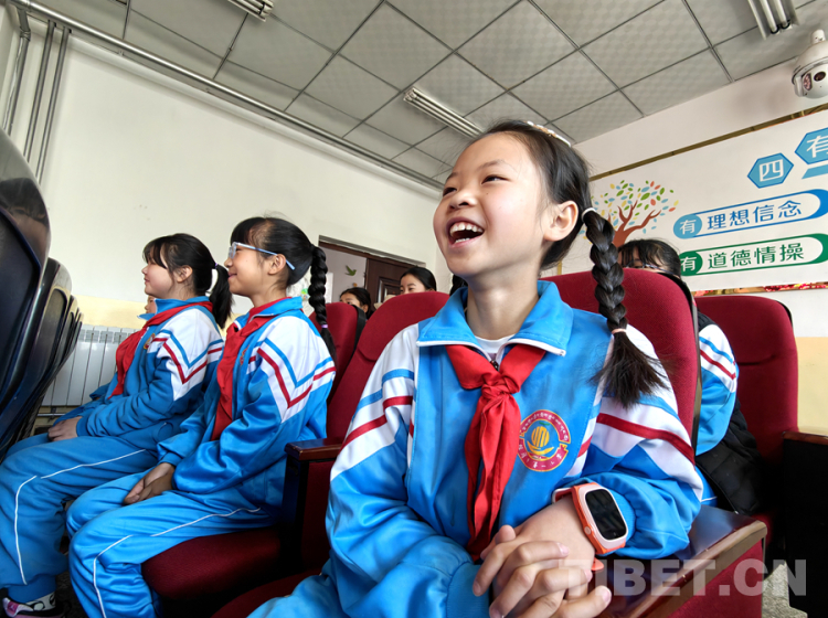 圖為(wei) 4月23日,西藏自治區新華書(shu) 店在拉薩市城關(guan) 區海澱小學開展的“享受閱讀 讓夢飛翔”閱讀校園行活動互動環節,有趣的互動把小學生給逗樂(le) 了 攝影:次旦拉姆