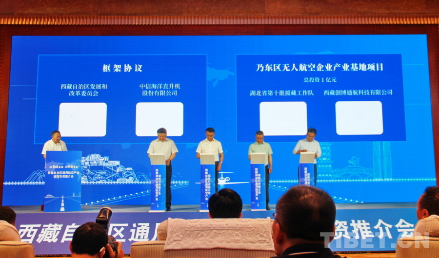 圖為(wei) 西藏自治區通用航空產(chan) 業(ye) 招商引資推介會(hui) 現場進行項目簽約 攝影:劉莉